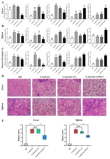 The effects of (r)OnC3 on inflammation after Nile tilapia infected with S. agalactiae (1 × 107 CFU/mL) in vivo and in vitro. (A) The mRNA expressions of inflammatory cytokines IL-6, IL-8, and TNF-α and anti-inflammatory cytokines IL-10 and TGF-β were detected from Nile tilapia liver at 12 h after challenge with (r)OnC3 protein and S. agalactiae. The control group was treated with 10 mM sterile PBS, and the rest of the groups were treated with S. agalactiae (1 × 107 CFU/mL), S. agalactiae + Trx protein (50 µg/mL), or S. agalactiae + (r)OnC3 protein (50 µg/mL). (B) The same inflammatory factors were detected in spleen, and the experimental conditions were the same as those in panel A. (C) The same inflammatory factors were detected in MO/Mø, and the experimental conditions were the same as those in panel A. (D) (r)OnC3 inhibited inflammatory infiltration in the bacterial-infected liver and spleen by H&E staining (×400). The control group was challenged with PBS, and the positive groups were challenged with S. agalactiae and S. agalactiae with Trx protein, respectively. The experiment groups were challenged with S. agalactiae with (r)OnC3 protein. (E) The injury score of liver and spleen. The error bars represent standard deviation (n = 3), and the significant differences are indicated by different letters (a, b, c, d) (p < 0.05) and asterisks (n.s. 0.05 < p, * 0.01 ≤ p < 0.05, ** p < 0.01).