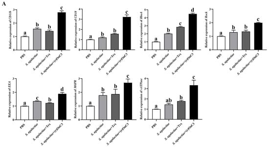 Moreover, the regulation of inflammation by (r)OnC3 after pathogen infection was also examined. Nile tilapia were intraperitoneally injected with 100 µL sterile PBS (10 mM), S. agalactiae (1 × 107 CFU/mL), S. agalactiae + Trx protein (50 µg/mL), or S. agalactiae + (r)OnC3 protein (50 µg/mL). The liver and spleen were harvested 12 hours after stimulation, and IL-1β, IL-6, TNF-α, IL-10, and TGF-β were detected. The isolation and culture methods of MO/Mø were the same as in Section 4.7. The head kidney (1 × 106 cells/mL) MO/Mø were treated with sterile PBS (10 mM), S. agalactiae (1 × 107 CFU/mL), S. agalactiae + Trx protein (50 µg/mL), or S. agalactiae + (r)OnC3 protein (50 µg/mL), and the cells were collected for RNA extraction after 12 h. The same inflammatory factors were detected by RT-qPCR.
