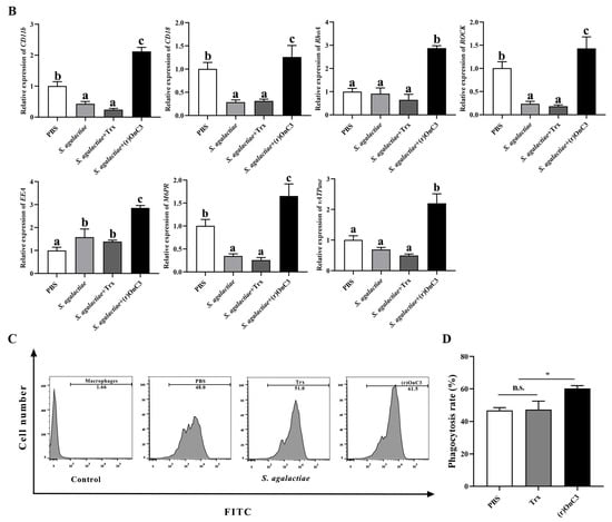 The regulatory effect of (r)OnC3 on Nile tilapia MO/Mø phagocytosis in vivo and in vitro. (A) The mRNA expressions of phagocytosis-related receptors and enzymes CD11b, CD18, RhoA, and Rock and lysosome-related genes EEA, M6PR, and vATPase were detected from Nile tilapia head kidney tissue at 6 h after treated with (r)OnC3 protein. The control group was treated with 10 mM sterile PBS, the rest of the groups were treated with S. agalactiae (1 × 107 CFU/mL), S. agalactiae + Trx (50 µg/mL) protein, or S. agalactiae + (r)OnC3 protein (50 µg/mL). (B) The mRNA expression of phagocytosis-related receptors and enzymes CD11b, CD18, RhoA, and ROCK and lysosome-related genes EEA, M6PR, and vATPase were detected from Nile tilapia MO/Mø at 6 h after treated with (r)OnC3 protein. The blank control group was treated with 10 mM sterile PBS, the rest of the groups were treated with S. agalactiae (1 × 107 CFU/mL), S. agalactiae + Trx protein (50 µg/mL), or S. agalactiae + (r)OnC3 (50 µg/mL) protein. (C) The phagocytic rate of MO/Mø to S. agalactiae (1 × 107 CFU/mL) was determined by flow cytometry. The MO/Mø phagocytosing S. agalactiae was preincubated with PBS, Trx protein, or (r)OnC3 protein, and the phagocytosis rates are shown near the marker. The histogram result shows the FITC intensity of the circled myeloid gate cells, and 10,000 cells were analyzed. (D) The phagocytosis rates. The error bars represent standard deviation (n = 3), and significant difference was indicated by different letters (a, b, c, d) (p < 0.05) and asterisks (n.s. 0.05 < p, * 0.01 ≤ p < 0.05).