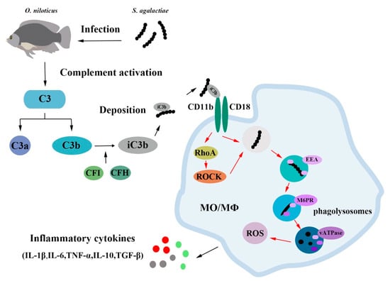 Phagocytic cells are chief components of innate immunity and act as a bridge between innate and adaptive immunity []. In mammals, activation of C3 is capable of affecting the phagocytosis of phagocytic cells such as macrophages or neutrophils []. Recent studies on pearl oysters pointed out that disrupting the C3 gene could significantly reduce the phagocytosis of Vibrio alginolyticus by blood cells, which also showed the importance of C3 in invertebrate phagocytes []. Phagocytes are also the first line of defense in the innate immunity of bony fishes. Recent studies pointed out that C3a enhances the phagocytic activity of B cells through C3aR in grass carp [,]. The fragments of C3, such as C3b and iC3b, are extremely important in the complement system for opsonophagocytosis [,,]. These fragments bind to complement receptors (CR) on the surface of macrophages, thereby affecting the phagocytic activity of macrophages, including CR1-CR4 []. CR3 (CD11b/CD18) is known as the principal β2 integrin, which plays a prominent role in recognizing bacteria. It can bind to inactivated C3b (iC3b) and activate phagocytosis [,]. Despite the signaling pathway(s) responsible for its cytokine response having not been scientifically elucidated, related studies also have reported that CR3-mediated phagocytosis requires the participation of RhoA and ROCK [,]. The Rho/ROCK signaling pathway acts on inducing cytoskeletal reorganization, cell migration, and stress fiber formation, thereby affecting tissue permeability and tissue contraction, and is also associated with phagosome formation [,,]. In this study, (r)OnC3 significantly enhanced the phagocytosis of S. agalactiae by Nile tilapia head kidney MO/Mø. The expression of CR3-mediated phagocytosis-related genes was detected as well. Notably, CR3 (CD11b/CD18), RhoA, and ROCK were all up-regulated. Significant up-regulation also occurred in association with phagolysosome formation such as EEA, M6PR, and vATPase []. These data suggested that OnC3 can effectively promote the phagocytosis of monocytes/macrophages. Although the functional characteristics of C3 in inflammation and phagocytosis have been elucidated at the gene expression level, it is better to confirm the C3 function at the protein level. As the expression level between proteins and mRNAs does not always show a simple linear relationship, follow-up studies at the protein level need further exploration.