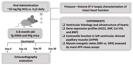 Schematic representation of the HCQ- vs. placebo (H2O) experimental design and the assessment of heart function in Tg-D94A vs. NTg mice. 5–8-mo-old Tg-D94A and NTg mice of both sexes were designated for HCQ (No = 16) vs. placebo (No = 16) treatment. Female and male mice were housed separately from each other, with 2–4 females and 1–5 males placed in one cage. After 30 days of treatment, the animals were evaluated for changes in the in vivo heart function, heart morphology, ultrastructure, and sarcomeric contractile and energetic properties.