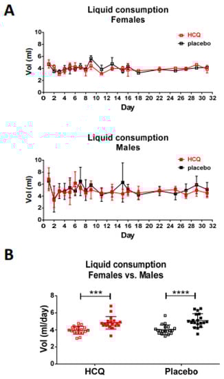 Daily fluid intake during HCQ treatment of Tg-D94A and NTg mice. (A) Daily liquid consumption of HCQ dissolved in drinking water (red symbols) vs. placebo/H2O (black symbols) by females (open symbols) and males (closed symbols). The placebo group comprised N° = 6 females and No = 6 males (3F and 3M mice per genotype), while the HCQ-treated group No = 8 females and No = 8 males (4F and 4M mice per genotype), with each gender housed in a separate cage. The volume of liquid consumption was recorded for each cage every day for the first 9 days of the experiment and then every 2–4 days, divided by the number of mice per cage and the interval between measurements, and further averaged per gender. The graphs in (A) show the average daily intake per animal. (B) Averaged liquid consumption per mouse per day. Open symbols represent female mice and closed-male mice. Data are presented as the mean ± SD. Statistical significance was assessed by two-way ANOVA followed by Sidak’s multiple comparison test and depicted as *** p < 0.001 and **** p < 0.0001 for female vs. male mice.