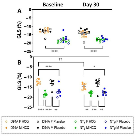 Cardiac performance of Tg-D94A vs. NTg mice assessed by speckle-tracking echocardiography. Top panel (A) shows pooled values of global longitudinal strain (GLS) from Tg-D94A vs. NTg groups at baseline and 30 days after treatment with HCQ or placebo (H2O), indicating an impaired cardiac function in the Tg-D94A group. The bottom panel (B) depicts GLS for each group and the effect of HCQ treatment over time. Data are presented as mean ± SEM of n = No animals (shown in Table 1), with significance calculated by unpaired t-test (A) and mixed-effects analysis followed by Sidak’s multiple comparisons test (B). Significance is denoted with * p < 0.05, ** p and †† p < 0.01, *** p < 0.001, and **** p < 0.0001. Asterisks (*) depict significant differences between Tg-D94A and NTg mice (±HCQ) and crosses (†) the differences between the values for Tg-D94A at baseline and after 30 days of HCQ treatment.