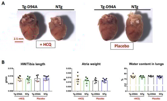 The effect of HCQ vs. placebo (H2O) treatment on gross morphology of Tg-D94A vs. NTg animals. (A) The hearts of 6-mo-old female Tg-D94A vs. NTg mice treated with HCQ vs. placebo (drinking water). (B) The heart weight/tibia length, atria weight, and the water content in the lungs of HCQ vs. placebo-treated Tg-D94A and NTg littermates. Hearts depicted with red triangles in the HW/tibia length graph represent the hearts pictured in Figure 4A. Open symbols show female and closed-male mice. Data are presented as the mean ± SD. No statistical significance was found by two-way ANOVA followed by Sidak’s multiple comparison test.