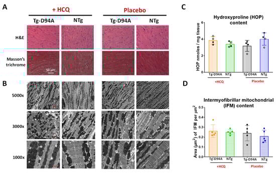 Histopathology and myocardial ultrastructure of the hearts of 6-mo-old Tg-D94A vs. NTg female mice treated with HCQ- vs. placebo. (A) Left ventricular (LV) samples stained with hematoxylin and eosin (H&E, upper panel) and Masson’s trichrome (bottom panel). (B) Transmission electron microscopy (TEM) images of sarcomeric ultrastructure of LV tissue of Tg-D94A and NTg mice. Images were taken at 1000×, 3000×, and 5000× magnification with scale bars of 4 µm, 1 µm, and 800 nm, respectively. Note some disrupted sarcomere structures and excessive vacuolar formations in the myocardium of Tg-D94A vs. NTg mice. (C) Quantification of fibrosis by hydroxyproline (HOP) assay. Data are presented as the mean ± SD (No = 4 animals/group). (D) Assessment of intermyofibrillar mitochondrial (IFM) content in the hearts of Tg-D94A vs. NTg female mice treated with HCQ- vs. placebo at 3000× magnification (scale bar 1 µm). IFM data (in µm2) are presented as the mean ± SD (n = 5 images). No statistical significance was found in fibrotic content or IFM between HCQ- or placebo-treated groups by two-way ANOVA followed by Sidak’s multiple comparison test.