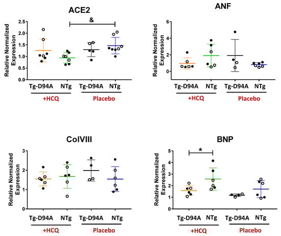 Gene expression profiles in HCQ- vs. placebo-treated Tg-D94A and NTg hearts. Expression of ACE2, ANF, BNP, and ColVIII was determined in the hearts of placebo-treated Tg-D94A vs. NTg mice and presented as relative expression normalized to the level of placebo-treated male NTg mouse (expression = 1). Data are the mean ± SD of n = No animals. No = 6–7 for HCQ-treated Tg-D94A and No = 4–5 for placebo-treated Tg-D94A. No = 6–7 for HCQ-treated NTg mice and No = 6–8 for placebo-treated NTg mice. Females are depicted by open symbols and males by closed symbols. Statistical analysis was calculated by two-way ANOVA followed by Sidak’s multiple comparisons test with significance depicted as * p < 0.05 for HCQ-treated Tg-D94A vs. NTg mice and & p < 0.05 for HCQ- vs. placebo-treated NTg mice.