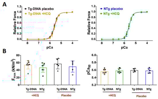 Contractile function in HCQ- vs. placebo-treated Tg-D94A and NTg hearts. (A) Force-pCa relationship in skinned LVPM fibers of HCQ and placebo-treated Tg-D94A mice (left) vs. NTg littermates (right). (B) Left: Maximal contractile force (in kN/m2) developed by LVPM fibers at saturating calcium concentrations (pCa 4) and calculated per cross-section of muscle fiber. Right: Myofilament calcium sensitivity of force (pCa50). Females are depicted with open symbols, and males are depicted with closed symbols. Each point represents an average of 2 to 4 fibers per animal. Values are the means ± SD of n = No animals. No = 7 mice for HCQ-treated Tg-D94A and No = 5 mice for placebo-treated Tg-D94A. No = 7 mice for HCQ-treated NTg and No = 5 mice for placebo-treated NTg. No statistical significance was found by two-way ANOVA followed by Sidak’s multiple comparison test.
