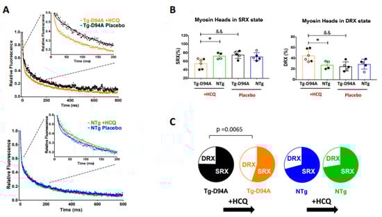 Here, we assessed the effect of HCQ on the SRX state of myosin and SRX↔DRX equilibrium in the hearts of mice using a single nucleotide exchange method in skinned LVPM fibers from Tg-D94A and NTg littermates (Figure 8). Fluorescence decay curves vs. time were collected on the exchange of fluorescent mant-ATP for non-labeled ATP (Figure 8A). The data were fitted to a two-state exponential equation to derive the amplitudes of the fast (P1) and slow (P2) phases of fluorescence decay and their respective T1 and T2 lifetimes (in seconds) [,]. To estimate the number of myosin heads that directly occupy the DRX vs. SRX states (Figure 8B), the rapid phase of the fluorescence decay (P1) was corrected for the fast release of nonspecifically bound mant-ATP, as described in Hooijman et al. []. The percent of myosin heads in the DRX vs. SRX states was then calculated using a correction factor of 0.44 for nonspecific mant-ATP binding, and the number of heads in the SRX state was estimated as P2/(1-0.44) []. Our results indicate that in the DCM Tg-D94A mouse model, the HCQ promotes the switch from the energy-conserving SRX state into the DRX state (Figure 8C). The SRX-to-DRX transition in the DCM Tg-D94A hearts is presumed to activate more cross-bridges to interact with actin and produce force (Figure 8C). This effect of HCQ is considered potentially beneficial for the Tg-D94A hearts, which show, consistent with DCM, hypocontractile phenotype []. It is anticipated that HCQ may improve the function of myosin motors and, thus, cardiac muscle contraction in DCM-D94A mice. No effect on SRX↔DRX equilibrium was observed in NTg mice (Figure 8, Table 3).