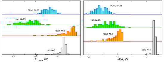 It may be noted that for all kinds of studied systems, in the vacuum calculations, the ELUMO energy is lower than the value of −EA; the difference exceeds 1 eV and does not change significantly with the system size. The opposite was observed in the PCM results: the ELUMO was higher than −EA, the difference between the two values was smaller than 0.5 eV and decreases with increasing N.