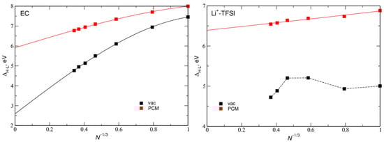 providing an estimate of the electrochemical window. In Figure 4 we present the ΔH-L values for EC aggregates and solvated LiTFSI, with the fits according to the Equation (7). The values extrapolated to the infinite system size are collected in Table 3. The gap values decreased with N and the values obtained in vacuum were about 2–2.5 eV lower than those calculated in the implicit PCM solvent. The largest ΔH-L value was obtained for solvated ion pair.