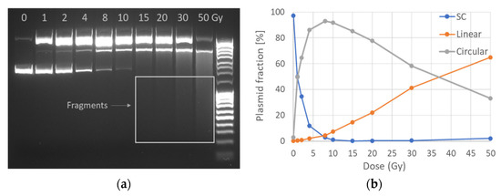 Electrophoretic plasmid analysis: (a) gel image of plasmid form transition for 10 different doses from 0 to 50 Gy with DNA ladder also included (right column). The original image has been slightly enhanced by increasing intensity in order to reveal low-intensity bands (small fragments) but not altered in other editing ways; SC, C and L are separated as expected due to their different DNA molecule mobility in the field. The image presented was oversaturated in order to visualize the fragments (smear in the last lanes). (b) Three plasmid forms transition with increasing dose as quantified according to gel band intensity.