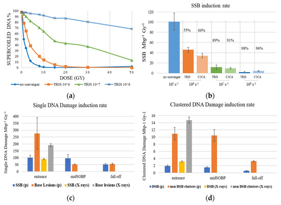 Proton (p) and X−rays−induced DNA damage. (a) Proton (entrance)−induced damage revealed as the decrease of SC plasmid with dose for Tris scavenging capacity ranging from no scavenging (105 s−1 of residual Tris) to 108 s−1, revealing the radioprotectant shielding of the plasmid integrity (up to 90%) the highest Tris concentration. (b) SSB Mbp−1 Gy−1 versus scavenging capacity for Tris and C3CA for 198 MeV protons at the entrance of the beam proves concentration-dependent manner. (c) Average number of SSB and single base lesions produced along the Proton Treatment Plan or X−rays, respectively. (d) Average number of DSB and non−DSB clustered damage produced along the Proton Treatment Plan or X−rays. The positions are the entrance of the beam, the middle of the SOBP plateau (midSOBP) and SOBP fall-off, as seen in Figure 3 and Table 1.