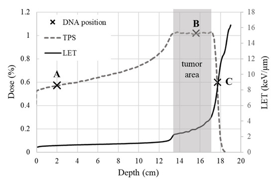 General treatment plan dose distribution: the % dose (dashed line) deposited when irradiating a volume of a hypothetical tumor of 4 cm thickness and approximately 13 cm under the skin (grey tumor area), as exported by TPS and the equivalent LET change over depth in water (solid line). The three positions of DNA irradiation (×) along the treatment plan are also marked: the beam entrance (A), the middle of SOBP plateau (B) and the SOBP fall-off (C).