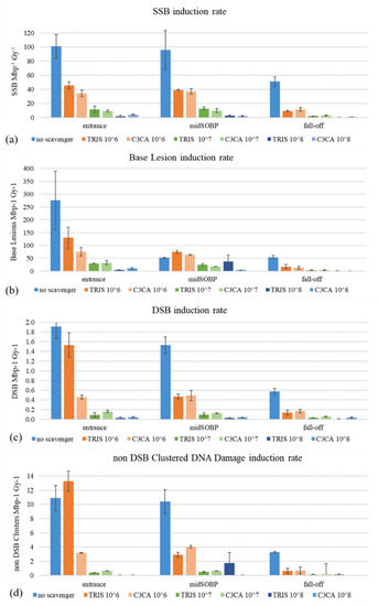 Figure 5a–d shows our experimental values together with the comparable literature data on the plasmid model. The numerical values of the present radiation conditions and the comparable literature data of the plasmid model can be found in Table A1 (Appendix A), accompanied by all critical radiation and sample parameters. For example, for DSBs in, the entrance reduction between ‘no scavenger’ to C3CA is ~76% falling to ~65% for the SOBP. Similarly, for non-DSB (base) clusters, from ~75% reduction (entrance), we go to ~60% for the SOBP region.