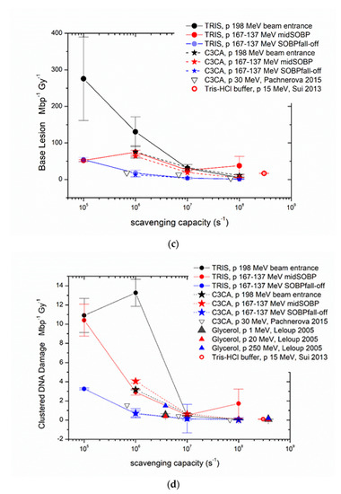 Proton (p)−induced damage yield (Mbp-1 Gy-1) versus scavenging capacity (s−1) as calculated in the present study for Tris and C3CA (lines are used as guides to the eyes) and literature values from studies using plasmid models with comparable proton energies and solution scavenging capacity. (a) SSB, (b) DSB, (c) Base Lesion, (d) Clustered DNA damage induction rates result from a variety of irradiation conditions, e.g., plasmid in solution or dried, different plasmid concentration and proton energy, details that can be found in Table A1. (see Refs. [28,32,33,34]).