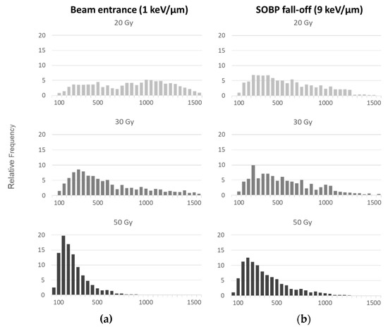 With increasing dose (Figure 7), there is a shift to smaller plasmid lengths revealed as increased DNA fragmentation due to multiple breaks. The same trend seems to follow the LET increase, since even in the case of small increment as in our experiment (Figure 7a corresponds to proton beam entrance and LET = 1 keV/μm, while Figure 7b to SOBP fall-off plasmid position with LET = 9 keV/μm) the fragment distribution shifts to smaller linear recorded DNA forms.