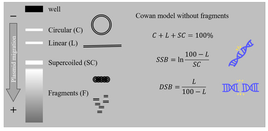 At this stage and under the presence of single- and double-strand breaks, plasmid DNA is separated into bands-fractions of different conformations: supercoiled (SC), circular (C) and linear (L) and fragments (F), with the last one being non-detectable due to method limitations (Figure 8). These patterns were visualized with green filter on an MYECL Imager, and band analysis was performed with the image processing program MYImageAnalysis™ v2.0 Software (Thermo Scientific, Waltham, MA, USA). The full-length molecule bands of SC, R and L were identified and integrated. The attempt to include F in the analysis was not always possible, as shorter-than-linear plasmid lengths have greater mobility in the electric field, appearing as a smear under L and SC bands that were not always countable. Averaged SC, C and L relative fractions are quantified by gel luminosity and translated into DNA breaks using Cowan model [45,46] (Equations in Figure 8).