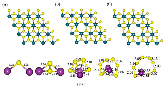 The optimized structures of (A) 1T-MoS2, (B) 1T-MoS2-1S, and (C) 1T-MoS2-2S and (D) Li2Sn (n = 1, 2, 4, 6, and 8), where teal, violet, and yellow colours denote Mo, Li, and S atoms, respectively. Atom bond lengths are in Å.
