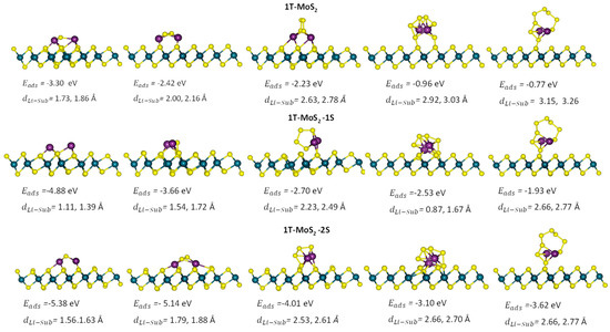 For the adsorption of Li2Sn (n = 1, 2, 4, 6, and 8) on pristine 1T-MoS2 and the defected structures, the vertical distances between two Li atoms to the surfaces were set initially according to the reported data [51] and then further adjusted by the DFT simulations of energy minimisation, see Figure 2. For the investigation of Li2S8 adsorption, the Li–Li bond was considered perpendicular to the 1T-MoS2 (001) structures, such that the Li2S8 molecule lied flat above the surface, consistent with the reported optimisation results [25,51].