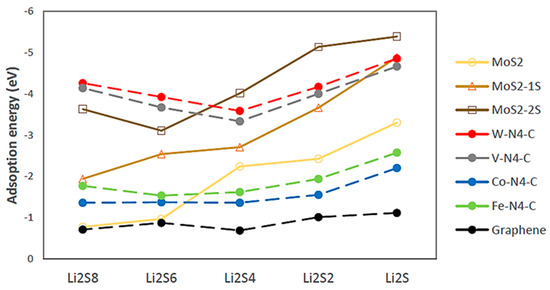 The higher adsorption energy for 1T-MoS2 with sulphur vacancies toward LiPSs intermediates, especially the lower order sulphides Li2S, Li2S2, and Li2S4, compared with 1T-MoS2 pristine can be explained based on the charge density. Research showed that the sulphur deficiency in the MoS2 structure resulted in larger charge densities of surrounding S atoms and therefore a tighter bond with Li atoms [51]. This would enhance the interaction with the LiPSs intermediates, providing more thermodynamics and kinetic driving force for binding and finally causing an increased stabilisation effect. Overall, Figure 3 illustrates that 1T-MoS2-2S (two sulphur vacancies) has better capability in trapping all sulphides than 1T-MoS2 and 1T-MoS2-1S.