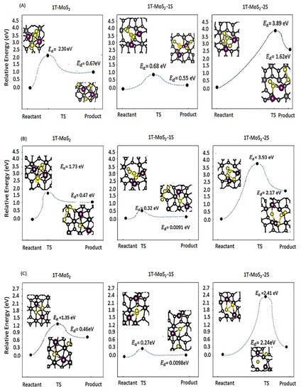 Dissociation energy graphs and atomic structures of reactants and products for the disproportionation reactions of (A) Li2S4 → Li2S2 + S2, (B) Li2S4 → Li2S + S3, and (C) Li2S2 → Li2S + S on 1T-MoS2 pristine, 1T-MoS2-1S and 1T-MoS2-2S. The relative energy change and reaction coordinate of the transition state (TS) and product with respect to the reactant is presented in the graphs. is the calculated activation barrier for the transition state and is the calculated dissociation energy to break the reactants bonds.