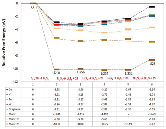 Figure 6 displays the relative Gibbs free energy profiles for the LiPSs disproportionation reactions on 1T-MoS2 substrates against graphene and TM-N4-C (TM = Co, Fe, V, and W) SAC materials, where an initial spontaneous exothermic reaction from S8 to Li2S8 is followed by a flatter profile with thermoneutral, or a small degree of exothermic or endothermic trends depending on substrate. It can be observed that the first step of Li2S8 production from S8 reactant is the most spontaneous according to the order: 1T-MoS2-2S > 1T-MoS2-1S > 1T-MoS2 > SACs. This means that the fastest reaction kinetics occurred on the 1T-MoS2-2S surface with Gibbs free energy value of −10.14 eV for the first conversion step.