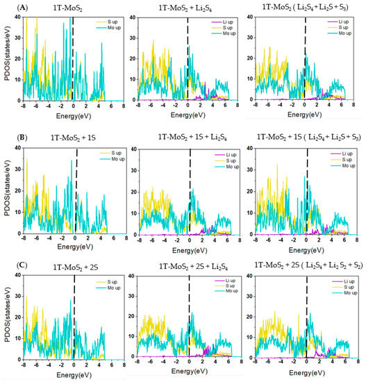Spin-resolved projected DOS profiles for (A) 1T-MoS2 pristine, (B) 1T-MoS2-1S, and (C) 1T-MoS2-2S for the disproportionation reactions of the preferred pathway for the conversion of Li2S4 to Li2S. The vertical dotted lines represent the Fermi energy level.