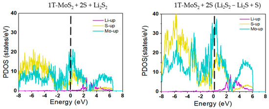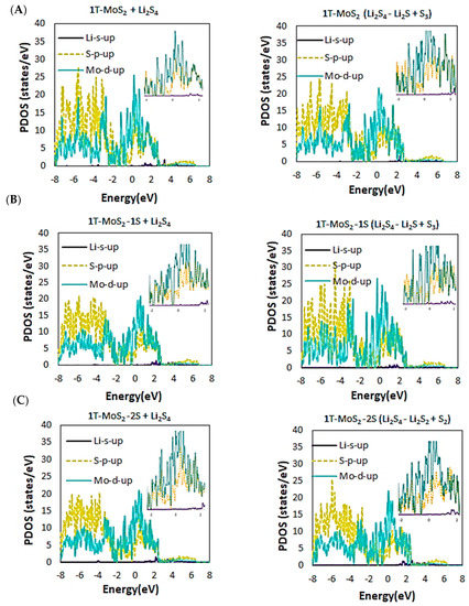 Figure 9 further presents the atom-projected PDOS plots for the last reaction step Li2S2 to Li2S of the preferred pathway on the 1T-MoS2-2S substrate, where no significant horizontal shifts are observed with respect to the Fermi level but the number of probability of states has increased especially for Mo near the Fermi level and for S away from the Fermi level throughtout the conversion reaction.