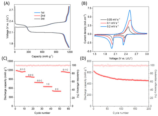 CV at different rates in Figure 10B displays a distinct peak upon charge and two distinct peaks upon discharge at the typical voltage positions as expected in Li-S cells [55,56]. The CV rate dependence of the overpotential and intensity of CV peaks is as expected in battery cells [57]. The polarisation at 0.2 mV s−1 is lower than expected, compared to the CV curve at 0.1 mV s−1, because the faster scan rate of 0.2 mV s−1 leaves shorter time for reaction and thus the reaction is less sufficient or it might result to a large amount of sulphide production over the solution saturation point that leads to early precipitation that might block good electron transport for further reaction. The cell demonstrates good cyclability in Figure 10A,C (97% capacity retention after 50 cycles in the schedule of Figure 10C) and almost 100% coulombic efficiency in Figure 10D, all attributed to the elimination of the shuttling of polysulphides given the high adsorption energy and good electrocatalytic properties for the related cathode host material as predicted by the DFT simulations. The fall of capacity of the cell cycled at 1C in Figure 10D, from 625 to 460 mAh gS−1 after 200 cycles, is attributed to issues of solid precipitation (sulphur precipitation in charge or Li2S precipitation in discharge) at the moderately high C-rate, rather than any shuttling effects, given that the capacity is stabilised at 460 mAh gS−1 after 200 cycles till a total 500 cycles tested so far.