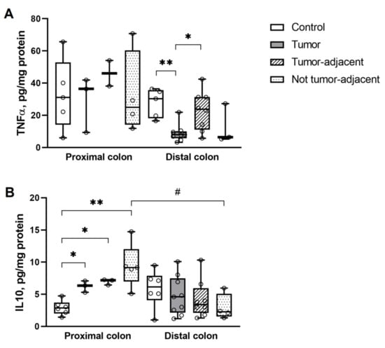 In the colon tissues, TNFα was different significantly only in the distal part. It was lower in the tumors compared to the control and tumor-adjacent tissues (Figure 1A). In comparison, IL10 was different only in the proximal part of the colon, where it was higher in tumors and non-tumor tissues compared to the control (Figure 1B).