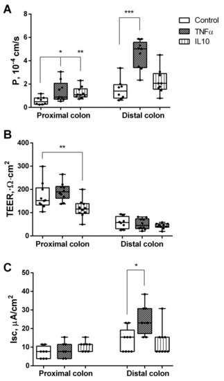 (A) Paracellular permeability for sodium fluorescein (P), (B) TEER, (C) Isc of the proximal and distal segments of the rat colon under the action of TNFα and IL10, * p < 0.05, ** p < 0.01, *** p < 0.001, Mann–Whitney U–test. The number of symbols corresponds to the number of samples.