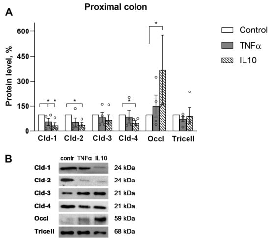 Western blot analysis of TJ proteins in the proximal colon. (A) Densitometric analysis revealed decreased Cld-1 under the action of TNFα, decreased claudin (Cld)-1, -2 and -4 and increased occludin (Occl) after IL10 action, Tricellulin (Tricell), * p < 0.05, Mann–Whitney U-test, n for each protein = 4. The values were normalized to total protein amount. The number of symbols corresponds to the number of samples. (B) Representative Western blot bands.
