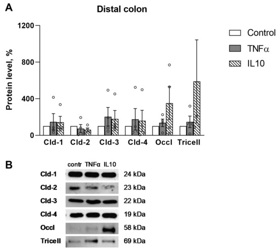 Thus, the cytokines induced a change in TJ proteins level only in the proximal part of the colon, and IL10 showed the most pronounced effect.