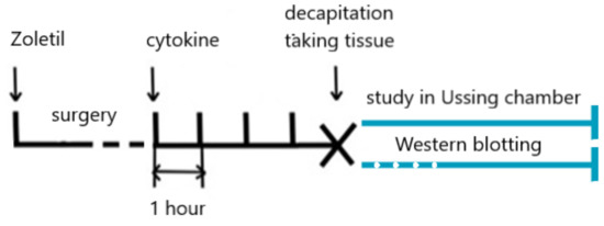 Animals weighing 280–380 g (n = 20) were randomly subdivided into four groups—one control group and three experimental groups with five animals in each group. The rats were anesthetized intraperitoneally with Zoletil 100 (Virbac, Carros, France, 100 mg/kg of the body weight). Narcosis was verified by the disappearance of the reaction to a painful stimulus (tail prick). An incision was made along the midline of the abdomen from the processus xiphoideus of the sternum in the distal direction. Two ligatures isolated the colon loop between the cecum and the anus, thus limiting the colon. Two tubes were inserted at the beginning and at the end of the loop, and the system was filled hermetically with the test solution. In the control group, the loop was luminally filled with Krebs-Ringer’s solution, while in the experimental groups it was filled with one of the cytokine solutions with 200 ng/mL TNFα and 100 ng/mL IL10. After 4 h of incubation the rats were decapitated, the large intestine was divided into proximal and distal segments, as described in our previous studies [34] and then investigated in Ussing chambers for 1 h (Figure 6).