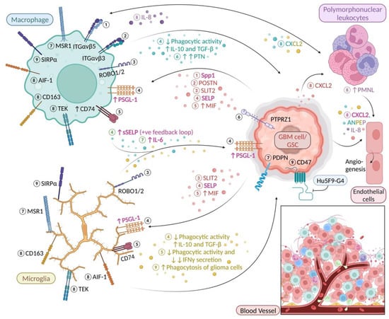 Microglia and macrophage surface molecules and cytokines in glioma. Molecular event ① Glioma cell-derived Secreted phosphoprotein 1 (Spp1) binds to ITGαvβ5 and induces macrophage recruitment to the TME [19] ② Glioma cell-derived periostin (POSTN) binds to ITGαvβ3 stimulating BMDM to enter the TME from the bloodstream [20] ③ GBM-derived Slit guidance ligand 2 (SLIT2) binding to Roundabout 1 and 2 (ROBO1/2) mediates microglia/macrophage chemotaxis [21] ④ GBM-derived SELP interacts with PSGL-1 altering microglia/macrophage phenotype by reducing phagocytic activity while upregulating IL-10 and TGF-β; exposure to soluble SELP (sSELP) creates a positive feedback loop leading to overexpression of P-selectin (SELP) and P-selectin glycoprotein ligand-1 (PSGL-1) by GBM and microglia cells [22] ⑤ Cells belonging to the monocytic subset of myeloid-derived suppressor cells (M-MDSCs) express high levels of CD74 in the presence of glioma-derived Macrophage migration inhibitory factor (MIF); CD74 activation weakens the microglial defence against glioma cells [23] ⑥ CD163+ glioma-associated macrophage secreted pleiotrophin (PTN) supports self-renewal and maintenance of GSCs via PTN–Protein tyrosine phosphatase receptor type Z1 (PTPRZ1) paracrine signalling [24] ⑦ MSR1+ microglia/macrophages in GBM upregulate expression of IL-6 and often co-reside with stem-like GBM cells expressing PDPN [18] ⑧ CD163 and TEK (TIE2) are exclusively expressed by AIF1 (Iba1)+ cells in GBM which contain a higher number of polymorphonuclear leukocytes/granulocytes; CXCL2 has been previously shown to attract granulocytes in mice and was found to be highly up-regulated by both glioma cells (red) and microglia/macrophages (yellow and blue) [25]; granulocytes were found to be the main source of IL-8 in GBM (purple) [26] stimulating recruitment of macrophages; CXCL2, IL-8 and ANPEP (CD13; blue, yellow and purple) are alternative proangiogenic factors [25,26,27,28] ⑨ anti-CD47 antibody Hu5F9-G4 promotes microglia/BMDM-mediated phagocytosis of glioma cells by blocking CD47-SIRPα interaction [29,30,31]. Font colour: magenta, “Janus” factors that are secreted by both microglia/macrophages and GBM cells/GSCs (cf. Table 1); green, molecules secreted by both microglia and BMDMs. “Created with BioRender.com”.
