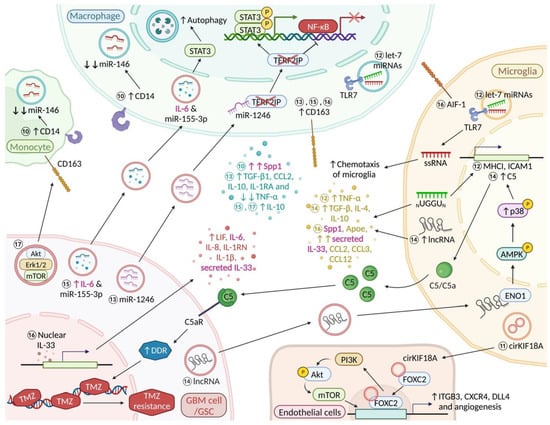 MicroRNAs, exosomes and a nuclear cytokine in microglia/macrophage-glioma interactions. Molecular event ⑩ Tumour supportive CD14+ monocytes and BMDMs downregulate microRNA-146 (miRNA-146) expression; CD14+ BMDM express high levels of Spp1 [35] ⑪ Microglial circKIF18A induces angiogenesis via CircKIF18A-FOXC2 nuclear translocation and ITGB3, CXCR4, and DLL4 transcription while concomitantly activating the PI3K/Akt pathway further promoting angiogenesis and GBM growth [67] ⑫ Let-7 microRNAs containing the sequence motif UUGU can suppress glioma growth through upregulation of TNF-α, MHC I and ICAM1; miRNA oligoribonucleotides that lack the GU-rich core motif may act as a chemoattractant for microglia in glioma [68] ⑬ miR-1246 binding to Telomeric repeat-binding factor 2-interacting protein 1 (TERF2IP) stimulates an immune suppressive phenotype in macrophages (increased CD163, IL-10, IL1RA, TGFβ1 and CCL2 expression, and significantly decreased TNF-α) via STAT3 and NF-κB pathways [69] ⑭ GBM-derived long noncoding RNAs (lnc-TALC) induces TMZ resistance via microglial complement components C5/C5a [70,71] ⑮ Glioma-secreted “hypoxic” exosomal IL-6 and miR-155-3p stimulate autophagy via STAT3 signalling and enhance CD163 and IL-10 expression in macrophages [44] ⑯ Glioma-derived IL-33 enhances activation of AIF1 (Iba1)+ resident microglia and recruitment of CD163+ BMDM [34]; microglial cells in the IL-33+ xenografts also expressed significant levels of IL-33 while upregulating pro-inflammatory cytokines, Spp1 and the lipid metabolism gene, Apoe followed by releasing a notable amount of the monocyte chemoattractant genes (CCL2, CCL3, and CCL12) ⑰ GSC-derived exosomes contain various immunosuppressive molecules that are part of the STAT3 pathway; GSCs-derived exosomes can induce CD163 expression in monocytes [72] Font colour: magenta, “Janus” factors that are secreted by both microglia/macrophages and GBM cells/GSCs (cf. Table 1). “Created with BioRender.com”.