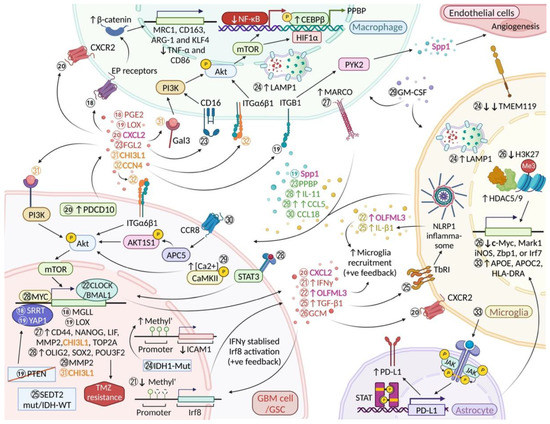 A recent study by Li et al. [80] has pointed out that GBM patients that respond exceptionally well to TMZ typically show fewer microglia/macrophages in association with GBM. Moreover, glioblastoma associated microglia/macrophages up-regulate expression of the proinflammatory cytokine interleukin 11 (IL-11), resulting in activation of the STAT3-MYC pathway in GBM cells. In addition to activating the STAT3 pathway, xenograft studies have shown that this mechanism is responsible for the induction of a cancer stem cell state in GBM cells (OLIG2, SOX2, and POU3F2 are up-regulated) [162]) leading to higher tumorigenicity and TMZ resistance (Figure 3, Molecular event 28). Furthermore, the production of microglial IL-11 was shown to depend on activation of the gamma isoform of myeloid-specific phosphoinositide-3-kinase (PI3Kγ) [80]. Using orthotropic murine GBM models, the authors demonstrated that inactivation of PI3Kγ reduces expression of microglia/macrophage-derived IL-11 and enhances TMZ efficacy. When STAT3 is silenced, migration of cancer stem cells towards macrophage secreted factors appears to be reduced; in fact, co-habitation of glioma stem cells and macrophages appears to result in bi-directional signalling that alters the phenotypes of both cell types [163].