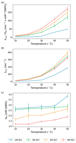 Calculated kinetic constants of wild-type for 1–4 M KCl and 10–50 °C. (a). Plots of the catalytic efficiency (kcat/Km, s−1 × mM ONPG−1) for the wild-type at 1 M KCl (blue), 2 M KCl (green), 3 M KCl (yellow), and 4 M KCl (red) are shown over the temperature range of 10–50 °C on the x-axis, with SEs shown as error bars. (b). Plots of the catalytic rate constant (kcat, s−1) for the wild-type at 1 M KCl, 2 M KCl, 3 M KCl, and 4 M KCl are shown over the temperature range of 10–50 °C on the x-axis, with SEs shown as error bars. (c). Plots of the Michaelis constant (Km, mM ONPG) for the wild-type at 1 M KCl, 2 M KCl, 3 M KCl, and 4 M KCl are shown over the temperature range of 10–50 °C on the x-axis, with SEs shown as error bars (n = 3).