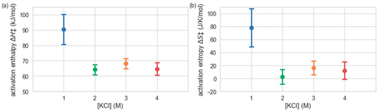 Activation enthalpies ∆H‡ (a) and activation entropies ∆S‡ (b), shown as a function of KCl concentration. Values and uncertainties were obtained by Bayesian fitting to temperature-dependent catalytic rates.