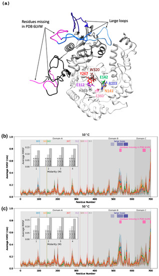 The structure of H. lacusprofundi β-galactosidase, with selected residues and domains labeled (a). RMSF profiles vs. sequence position for temperatures 10 °C (b) and 50 °C (c) with KCl molarities 1 M (blue), 2 M (green), 3 M (orange), and 4 M (red). Eight active site residues (103R, 141N, 142E, 267Y, 312E, 320W, 360E, 363H) are shown as vertical lines at their sequence positions. The three domains are shaded in light gray for domain A (residue 1–390), medium gray for domain B (residue 391–614), and dark gray for domain C (615–700). The averages of the average RMSF values per domain are shown in the inset graph on the upper left side of each graph. The sequence positions of the three large loops from domain B are shown using blue rectangles (residues 485–503, 519–551, 555–577). The sequence positions of the residues missing in the crystal structure are shown using pink rectangles (residues 532–543, 657–672, 697–700).