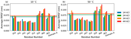 Bar graphs showing the RMSF values of the eight active site residues at 10 °C (a) and 50 °C (b). The average RMSF values per molarity for domain A are shown as horizontal lines.
