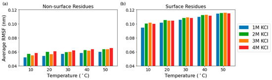 Average RMSF of the non-surface residues (a) and the surface residues (b).