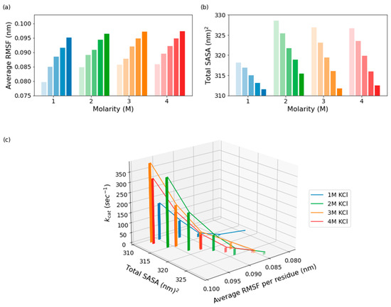 The solvent-accessible surface area and the catalytic rate constant show a similar pattern, with a drastic increase both in the SASA and the catalytic rate constant from 1 to 2 M followed by a plateau for the higher salinities. The catalytic rates observed suggest that there is a minimum salinity required for optimal activity with little to no improvement with increased salinity above the threshold of 2 M KCl. The observed flexibility of the solvent-accessible surface area is lowest for 1 M KCl while 2–4 M KCl are very similar. This suggests the salinity effect on the catalytic rate is influenced by the “softness” as it is described by Aqvist et al., or flexibility, of the surface of the protein [21]. Our previous mutagenesis studies have shown that residues distant from the active site can have an effect on the catalytic rate of this polyextremophilic protein [15,16]. This is similar to the effects seen with temperature with cold-adapted proteins in general having more surface flexibility [23]. This trend is also demonstrated in our study, with more solvent-accessible surface area predicted at the lower temperatures (Figure 6b).