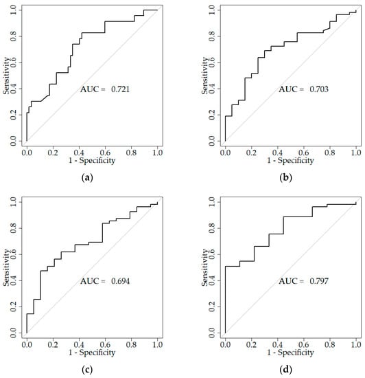ROC curves reflecting the sensitivity and specificity of carbonyl groups concentration measurements for patients with a favourable functional outcome: (a) CG < 4.5 h; on admission (cut-off point ≤ 236.38 U/mL, sensitivity 82.6%, specificity 57.9%), (b) CG < 4.5 h; after discharge (cut-off point ≤ 256.05 U/mL, sensitivity 69.0%, specificity 70.0%), (c) CG < 4.5 h; after three months (cut-off point ≤ 198.22 U/mL, sensitivity 47.2%, specificity 89.5%), (d) CG < 4.5 h; after a year (cut-off point ≤ 198.22 U/mL, sensitivity 50.9%, specificity 100%).