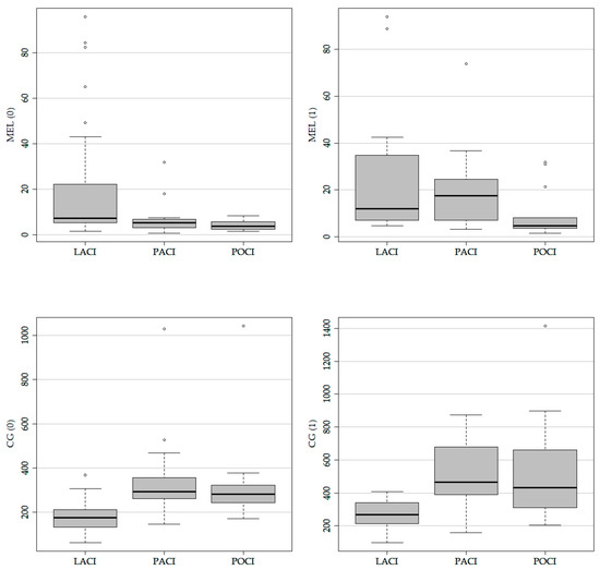 In patients with LACI stroke, MEL concentrations measured in time <4.5 h were statistically higher than in patients with POCI and PACI stroke subtypes (7.27 with IQR 5.31–22.29 vs. 5.32 with IQR 3.55–6.84 pg/mL, p = 0.008; 7.27 with IQR 5.31–22.29 vs. 3.73 with IQR 2.60–5.61 pg/mL, p < 0.001, respectively). Additionally, differences in MEL concentrations for LACI and PACI stroke were observed, which were assessed within 24 h (11.84 with IQR 7.05–34.29 vs. 4.72 with IQR 3.65–8.02 pg/mL, p = 0.02) after the stroke. A summary of the obtained results is presented in Table 5 and Figure 3.
