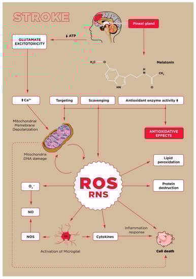 - Andrabi, S.S.; Parvez, S.; Tabassum, H. Melatonin and ischemic stroke: Mechanistic roles and action. Adv. Pharmacol. Sci. 2015, 2015, 384750. [Google Scholar] [CrossRef]