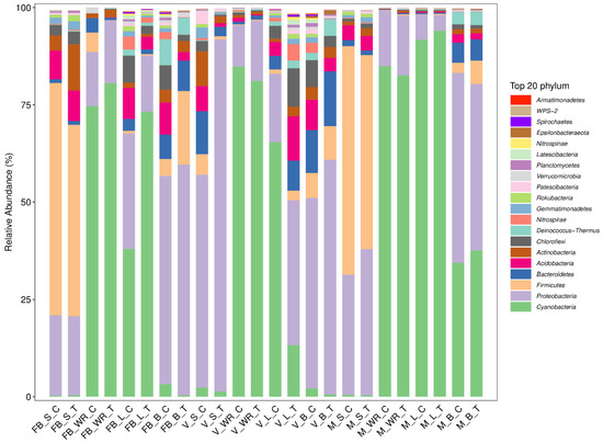 Microbial community structure across the grapevine habitats is exposed at the phylum level (Figure 1). The relative abundance of Cyanobacteria was 40%, Proteobacteria 32%, Firmicutes 12%, and Bacteroidetes 4%, which were most abundant across all the treated and control plant organs at all growth stages. The highest relative abundance of Cyanobacteria was 94.03% in maturity leaf treatment (MLT) and the lowest in full bloom soil control (FBSC). Proteobacteria was profused in veraison soil treatment (VST) 90.42% and minimal abundant in MLT. Firmicutes were at 59.57% in the soil of control plants at the full bloom stage (FBSC), and 0.13% in the full bloom white roots treatment (FBWRT). Bacteriodiates were maximum classified at 14.04% in V_B_T (veraison, berry of treated plant) and were minimum in maturity white roots control (MWRC). Regarding the plant organs, rhizosphere soil had a maximum relative abundance of Proteobacteria with 90.42% at the veraison stage of treated plant (VST) and Cyanobacteria with 0.25% at the full bloom stage of control plants (FBSC). White roots were composed of 84.87% of Cyanobacteria at the maturity stage of control plants (MWRC) and a minimal abundance of Bacteroidetes with 0.12% at the maturity stage of control plants (MWRC). Leaves of the treated plant at maturity stage (MLT) had 94.03% of Cyanobacteria and 0.29% of Bacteroidetes at maturity stage (MLT). The flower of the treated plant at full bloom (FBBT) and berry of the treated plant at the veraison stage (VBT) was enriched with Proteobacteria at 59.17% and 64.46%, respectively. A minimal abundance of Firmicutes was observed in full bloom berry control (FBBC) at 4.25% and 2.66% at maturity berry control (MBC). For a detailed relative abundance of these phyla, see Supplementary Materials Table S2.