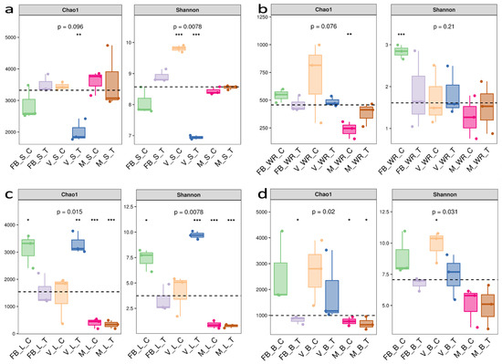Alpha diversity analysis was used to investigate the species richness and evenness of a bacterial ecosystem within the rhizosphere (soil and white roots) and phyllosphere (leaves, flower and berry). To validate our sample size, species accumulation curve and rank abundance curve were formulated (Supplementary Materials Figures S3 and S4). Alpha diversity was assessed by Chao1 and Shannon indices (Figure 2). The rhizosphere soil had Chao1 (p = 0.096) maximum at maturity soil treatment (MST), while Shannon (p = 0.0078) was at veraison soil control (VSC) (Figure 2a). White roots had Chao1 (p = 0.076) maximum at veraison white root control (VWRC) while Shannon (p = 0.21) at full bloom white root control (FBWRC) (Figure 2b). Shannon (p = 0.0078) and Chao1 (p = 0.015) were maximum at veraison leaf treatment (VLT) (Figure 2c). The flower was contemporary to the full bloom stage, so it has higher Chao1(p = 0.02) and Shannon (p = 0.031) at full bloom berry control (FBBC). Berries have higher Chao1 (p = 0.02) and Shannon (p = 0.031) at veraison berry control (VBC) (Figure 2d).