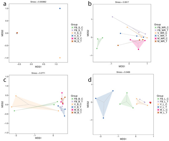Bacterial community structures were visualized by nonmetric multidimensional scaling (NMDS) based on the Bray–Curtis distance. Dissimilarities between the organs at different phonological stages were measured with orientation to control and treatment. The soil at the veraison stage of treatment and control plants (FBST and FBSC) showed a significant community shift (r2 = 0.87, p < 0.001, stress = 0.000862). In contrast, as indicated in the plot, all other groupings were centred on a single spot (Figure 3a). In Figure 3b, white roots were most distinct between treatment and control plants at full bloom, followed by maturity (r2 = 0.58, p < 0.001, stress = 0.0917). In Figure 3c, our treatment impacted the bacterial community structure only during the full bloom and veraison stages in the leaves of treated and control plants (r2 = 0.68, p < 0.001, stress = 0.0488). In Figure 3d, the root-zone restriction influenced the community composition in the berries at full bloom and veraison, although the communities at maturity were identical (r2 = 0.42, p < 0.005, stress = 0.0771). To comprehend the beta diversity of microbial communities established as a result of the NGS, we constructed a hierarchical clustering analysis known as UPGMA. Plant tissues were similar intra-group of treatment and control but at a distance in the case of the intergroup (Supplementary Materials Figure S5).