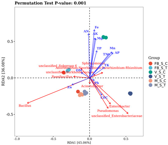 Soil chemical properties are in Table 2 and Supplementary Materials Figure S7. The relation of the soil chemical properties towards the structuring of the bacterial community was explored by constituting a redundancy analysis, which indicated that the soil nutrition, growth stage and root-zone restriction technique are the primary driver of the bacterial diversity in the soil. The two axes of the RDA plot explain 81.14% of the total variation caused by the soil factors with the Monte Carlo permutation p < 0.001 and the corresponding correlation factor r2 (Figure 4). The soil pH (r2 = 0.48) significantly affected the abundance of unclassified Enterobacteriaceae, whereas cec (r2 = 0.31) provoked the abundance of Enterobacter and Pseudomonas in VST. Zinc (r2 =0.62) turned out to be the major contributor to the diversity of Bacillus sp at MSC and MST. OM (r2 = 0.47) considerably regulated the bacterial community at FBST, and the most affected genus was Allorhizobium-Neorhizobium-Pararhizobium-Rhizobium. AN (r2 =0.61), TN (r2 =0.38), AK (r2 = 0.59), TK (r2 = 0.0.41), AP (r2 = 0.34), TP (r2 = 0.24), Mg (r2 = 0.49), and Mn (r2 = 0.0.34) were responsible while Fe (r2 = 0.73) being most correlated with Sphingomonas at VSC in terms of shaping the bacterial population and Devosia, Pseudolabrys and Duganella were the most affected genera.